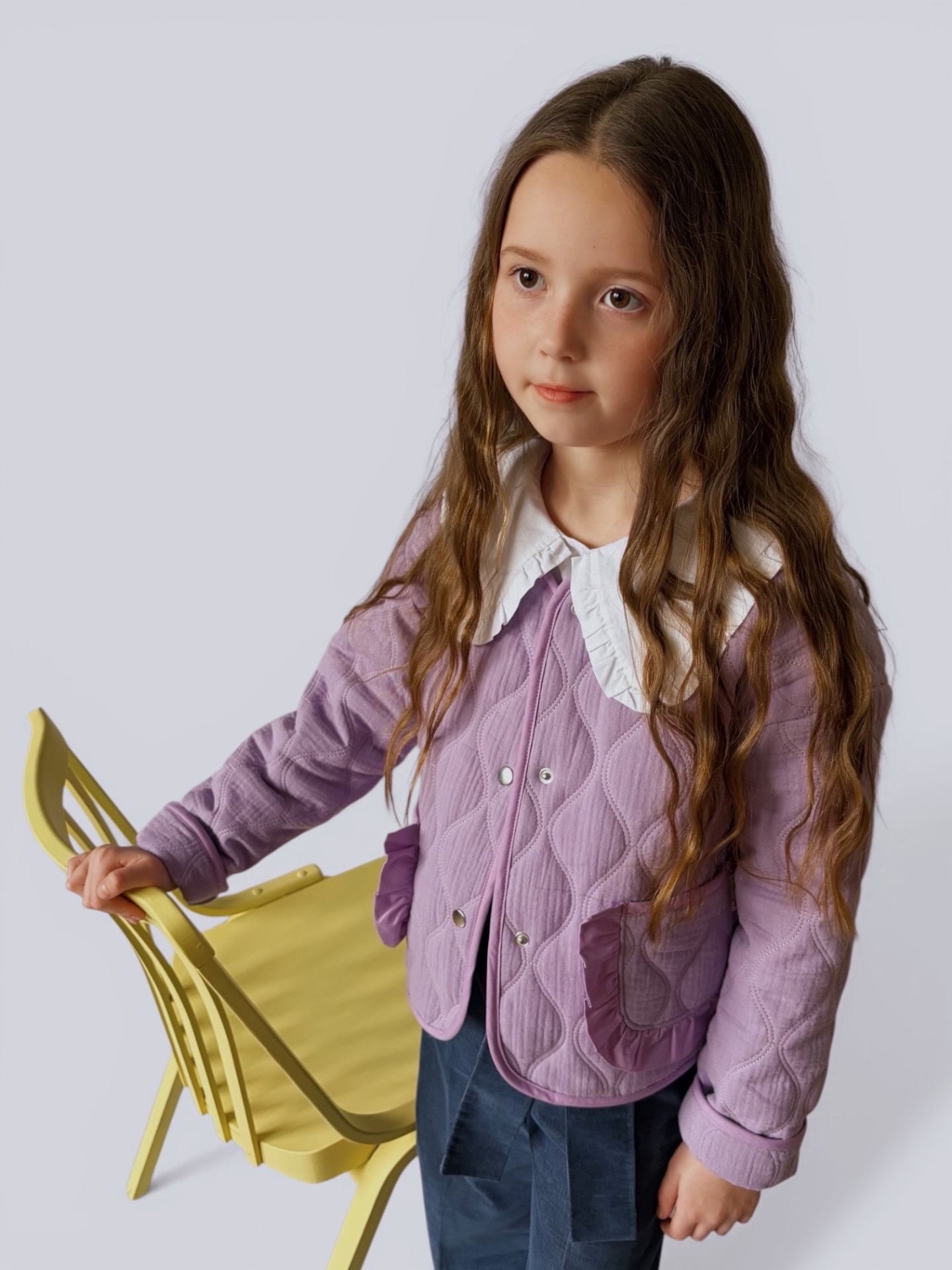 Stejně jako u dospělé varianty i zde vyniká jemný romantický detail – kapsy zdobené volánky, které kabátku dodávají hravost a něžný charakter.
