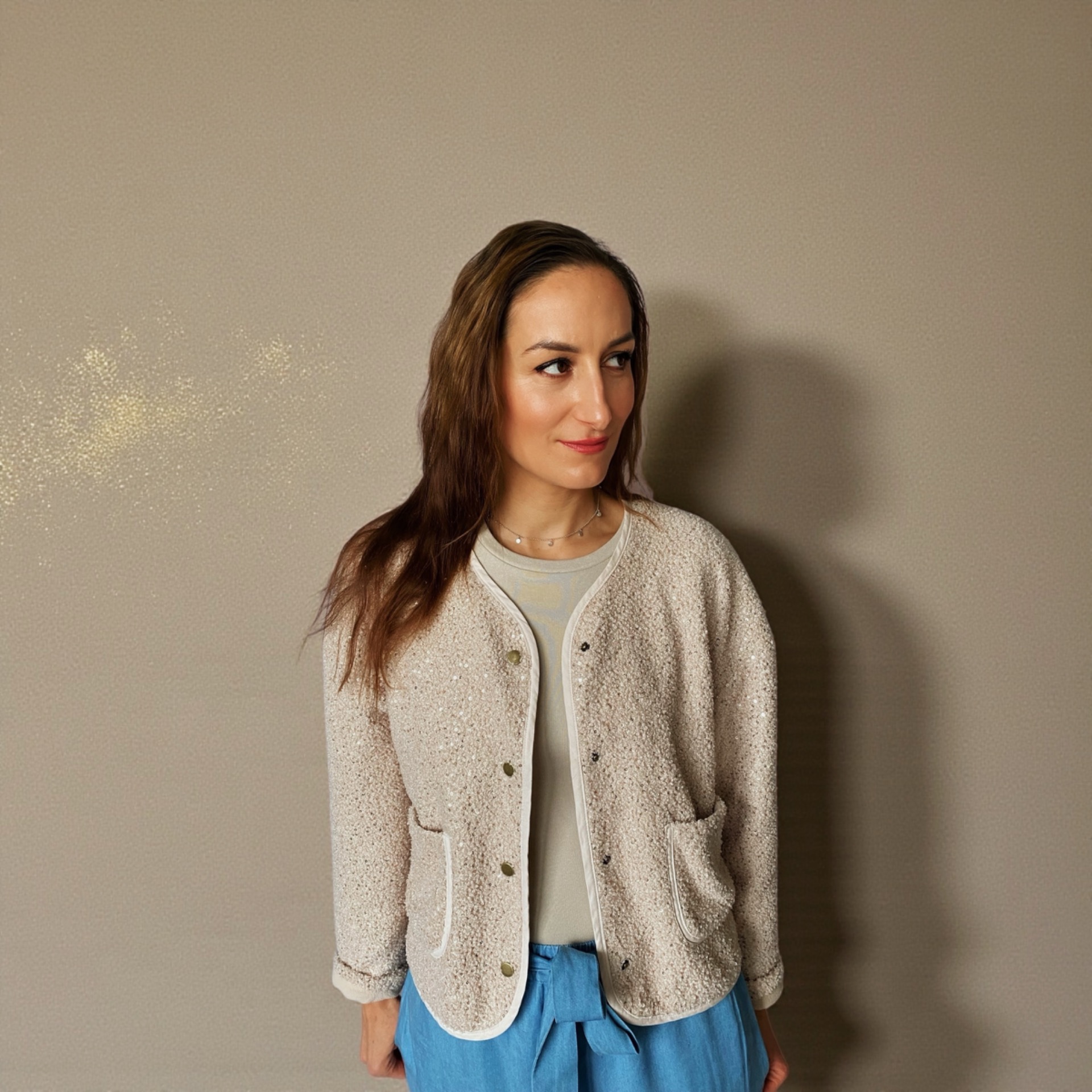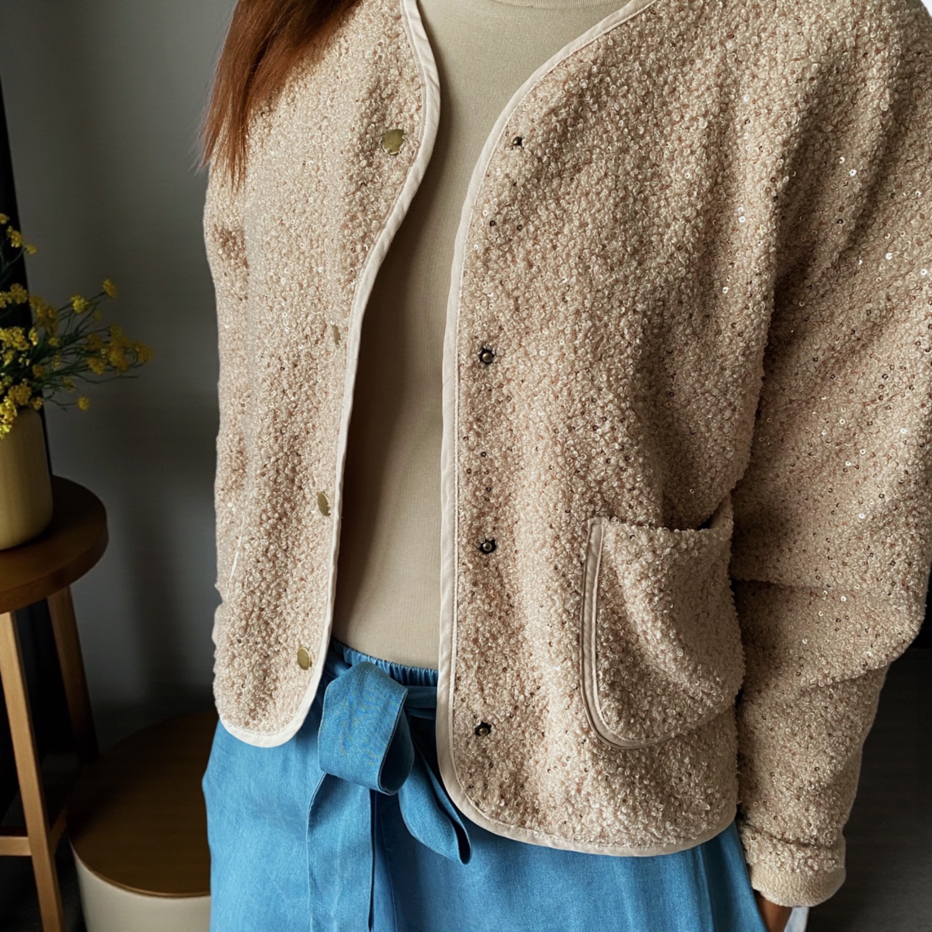 Kabátek Chloé – Sparkle Edition přináší oblíbený střih kabátku Chloé v nové, třpytivé podobě. Vrchní materiál s jemnými flitry dodává celému modelu decentní lesk a elegantní šmrnc, aniž by působil příliš výrazn. Střih je pohodlný, lehce boxy, s oblými okraji, dvěma kapsami a zapínáním na patentky z mosazu.