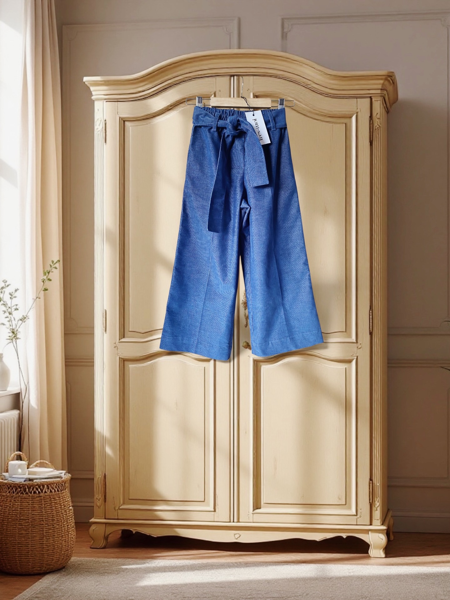Kalhoty "Stella" spojují ležérní pohodlí a stylový vzhled. Měkký bavlněný babykord s denimovým nádechem a volný střih s páskem v pase tvoří moderní, ale stále hravý look.