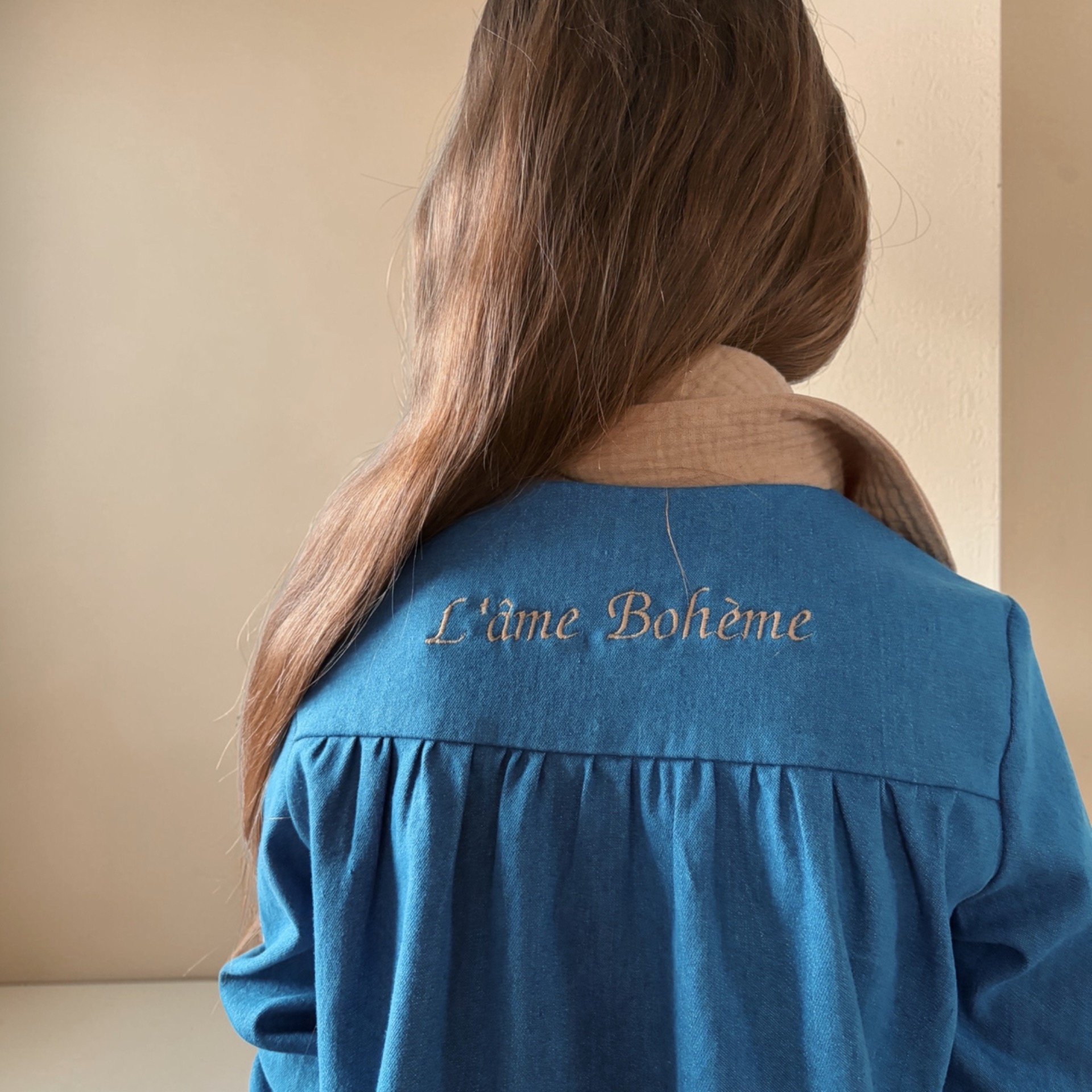 Charakteristickým detailem je dvojité zavazování na mašličky a jemné řasení, které dodává šatům lehkost a pohyb. Na zádech je výšivka "L'âme Bohème", která podtrhuje jejich jedinečný charakter.