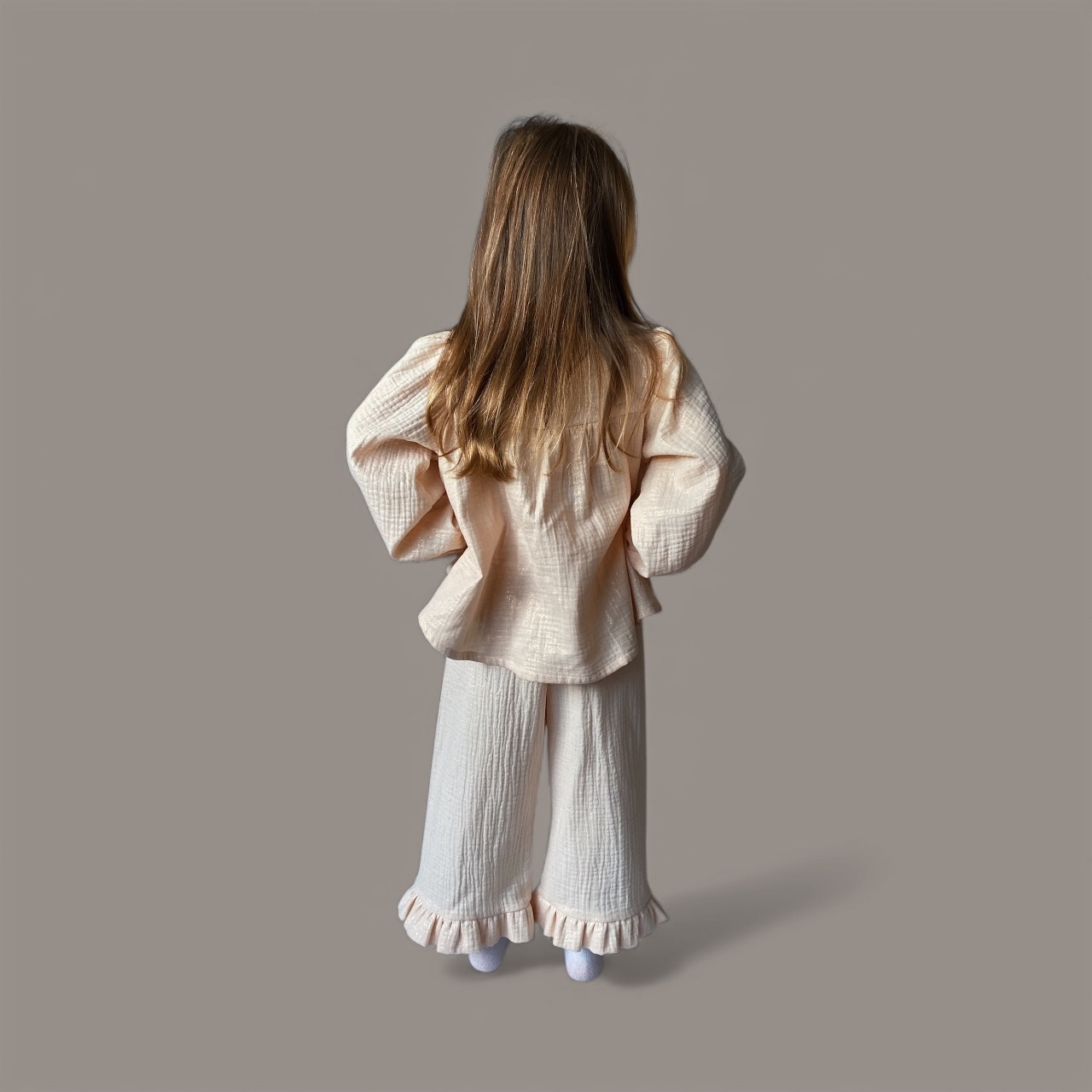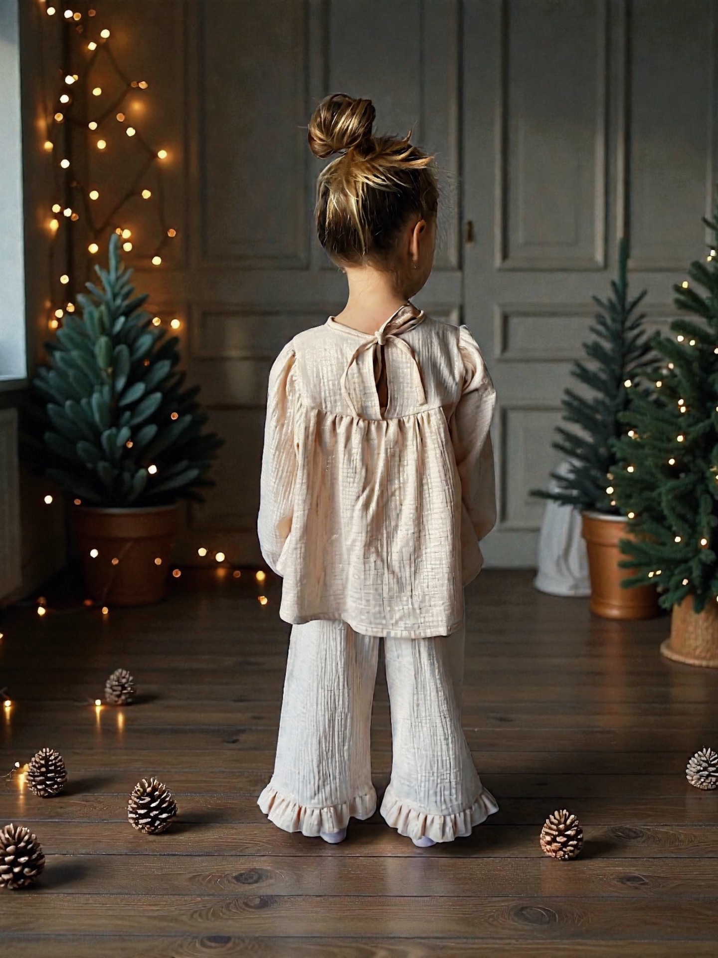 Set Clara + Rosie Frill je dokonale sladěný outfit z Festive Collection, navržený pro malé velké okamžiky vánoční sezóny. Halenka Clara s jemným volánkem a elegantním zavazováním na zádech působí něžně a slavnostně, zatímco kalhoty Rosie Frill dodávají celku lehkost a hravý pohyb díky volánkovým nohavicím.