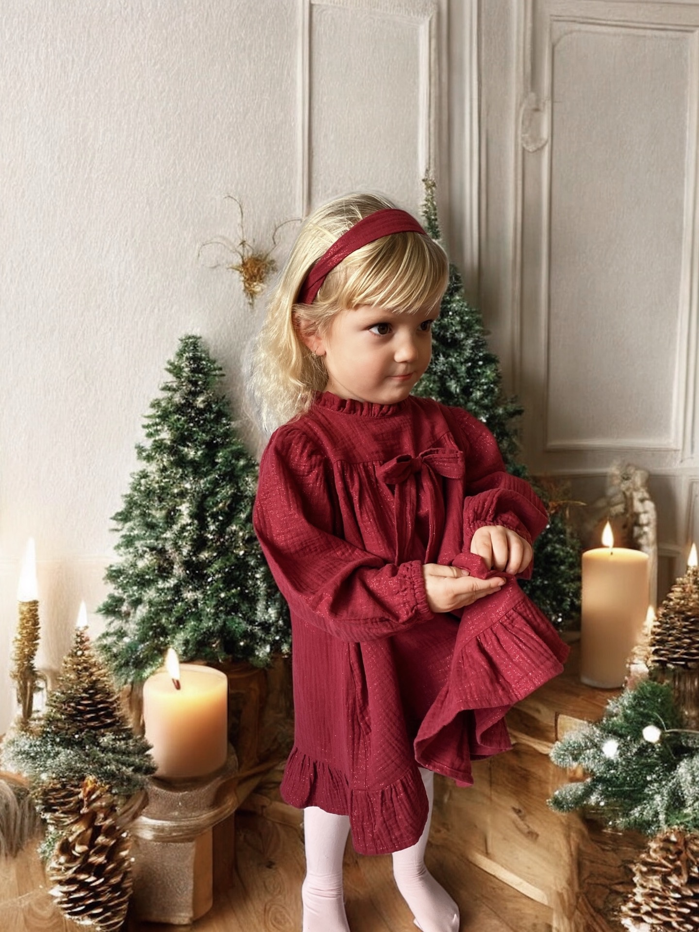 Materiál tvoří 100% bavlna s certifikací OEKO-TEX® Standard 100, která je šetrná k dětské pokožce. Díky gramáži 115 g/m² jsou šaty příjemně lehké, vzdušné a ideální pro adventní období, vánoční focení, besídky i všechny malinké sváteční okamžiky.