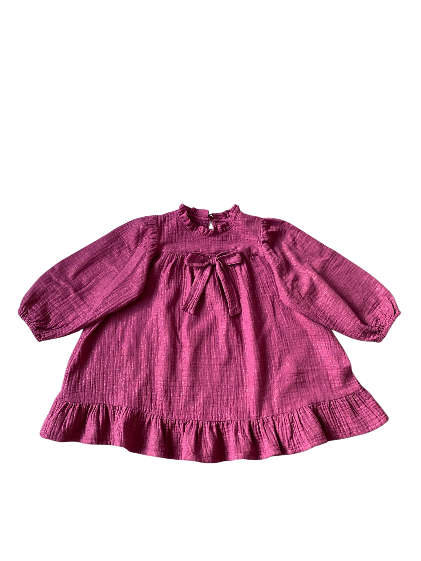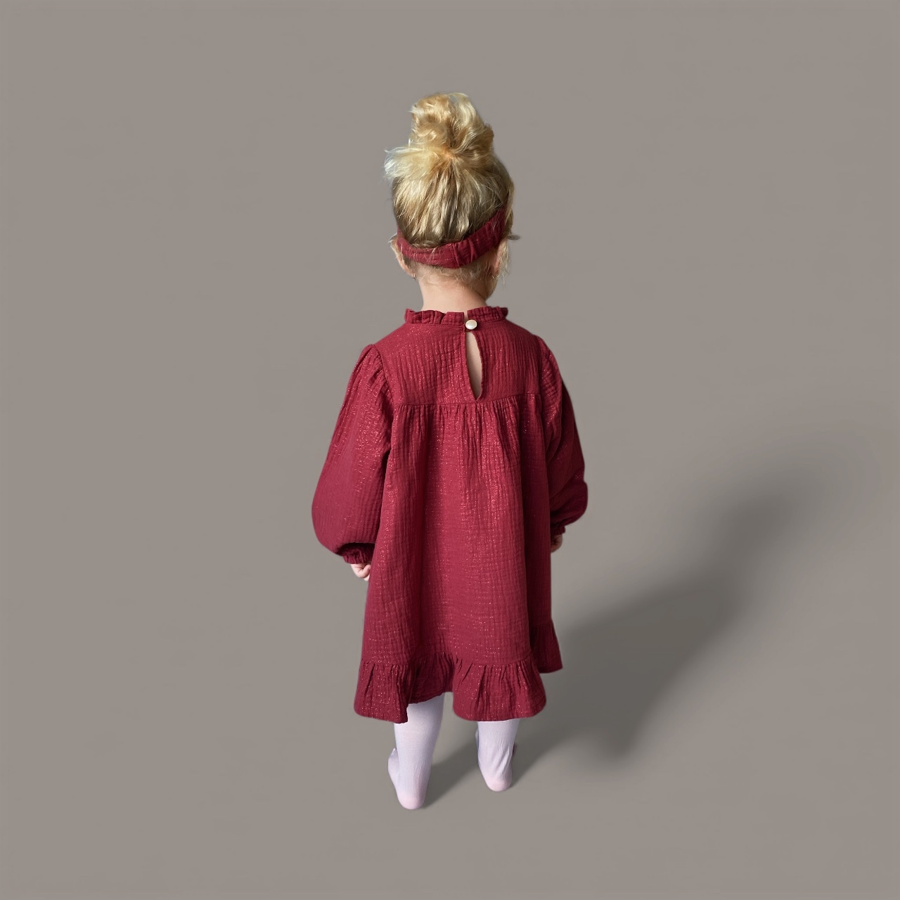 Šaty Charlotte Frill jsou další slavnostní verzí našich oblíbených Charlotte, doplněné o elegantní volánkový stojáček, který dodává šatům hravost i výjimečnost. Lehký střih se spodním volánkem a měkkým nařasením vytváří něžnou siluetu a krásně se pohybuje při každém kroku. Třpytivý mušelín působí luxusně, ale zůstává měkký, prodyšný a komfortní i na celodenní nošení.