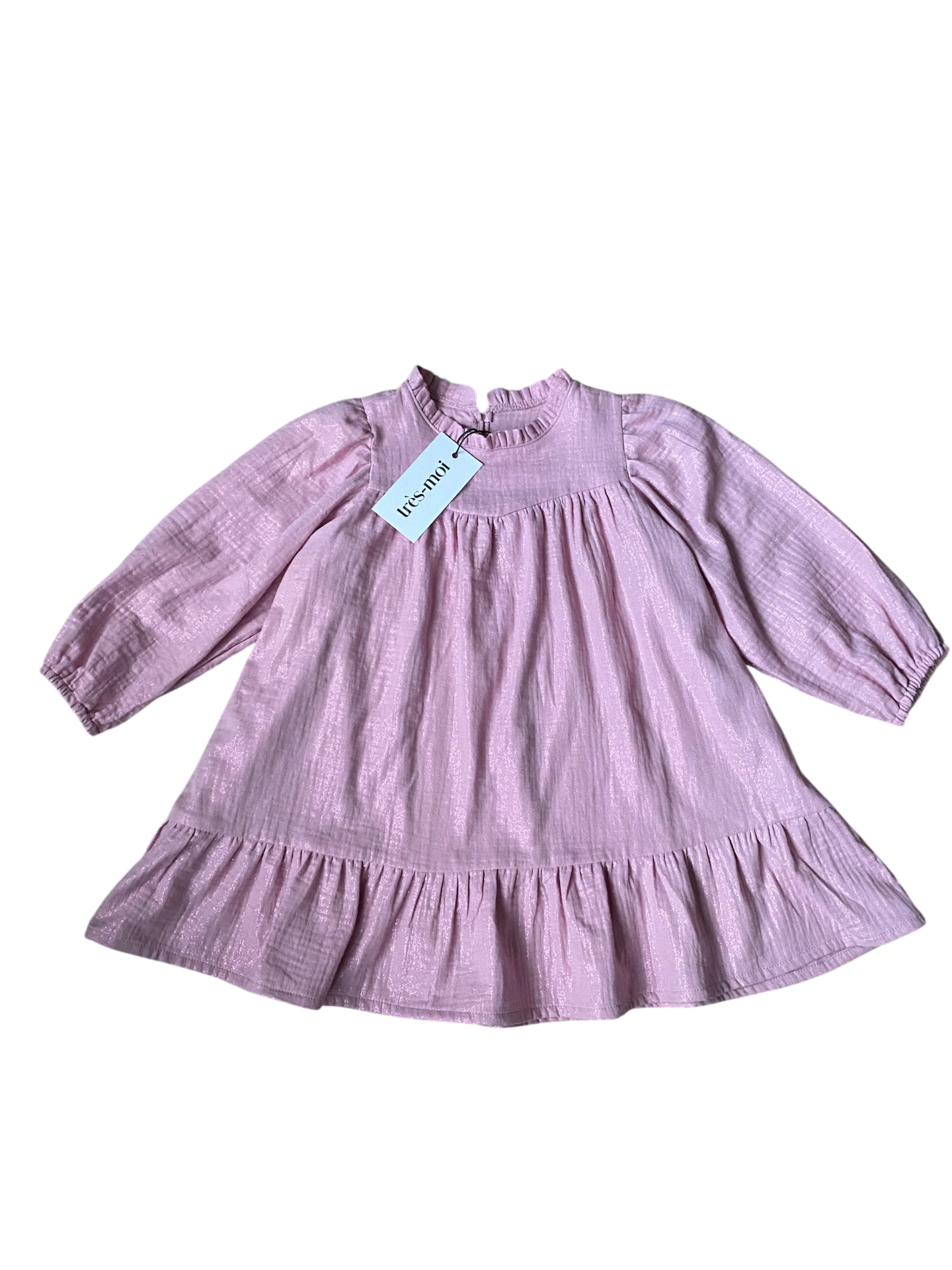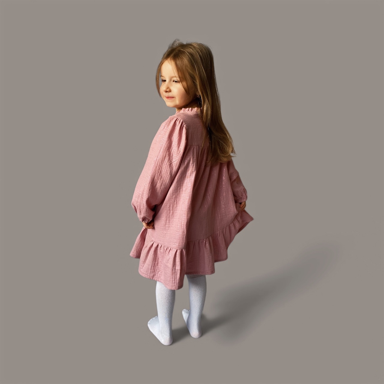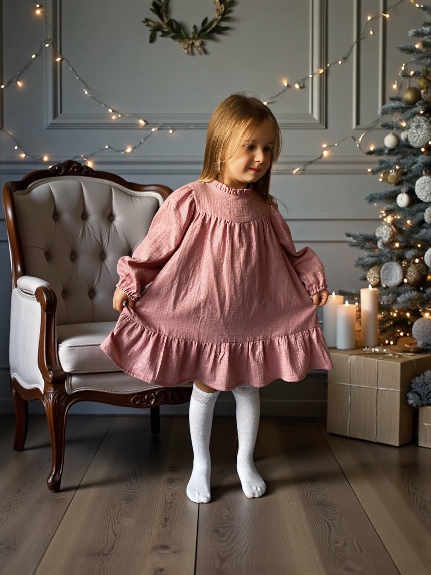 Šaty Charlotte ve slavnostní vínovébarvě jsou elegantním kouskem, který vnáší do vánočních dní jemnost, třpyt a výjimečnou atmosféru. Střih s měkce nařasenou sukýnkou vytváří něžnou siluetu a při pohybu působí hravě i velmi svátečně. Mušelín s jemným třpytem dodává šatům luxusní vzhled, zároveň zůstává měkký, lehký a příjemný i na celodenní nošení.